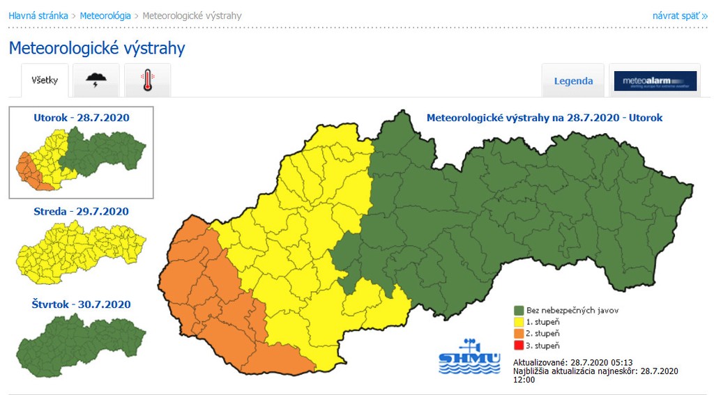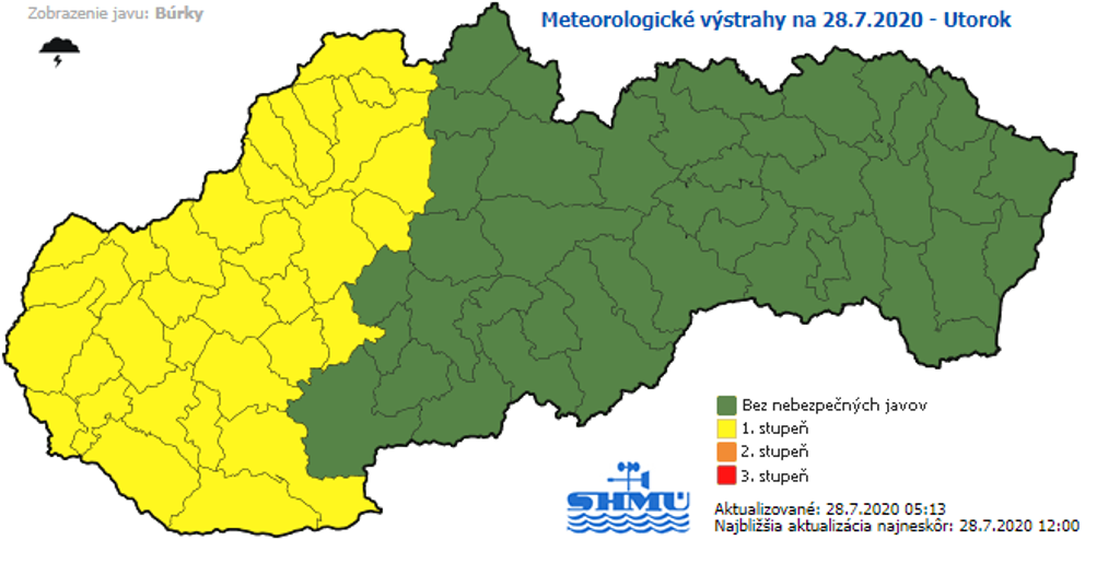 SHMÚ už vydal na utorok aj výstrahu prvého stupňa, a to pre Bratislavský, Trnavský, Trenčiansky, Banskobystrický, Nitriansky a Žilinský kraj.