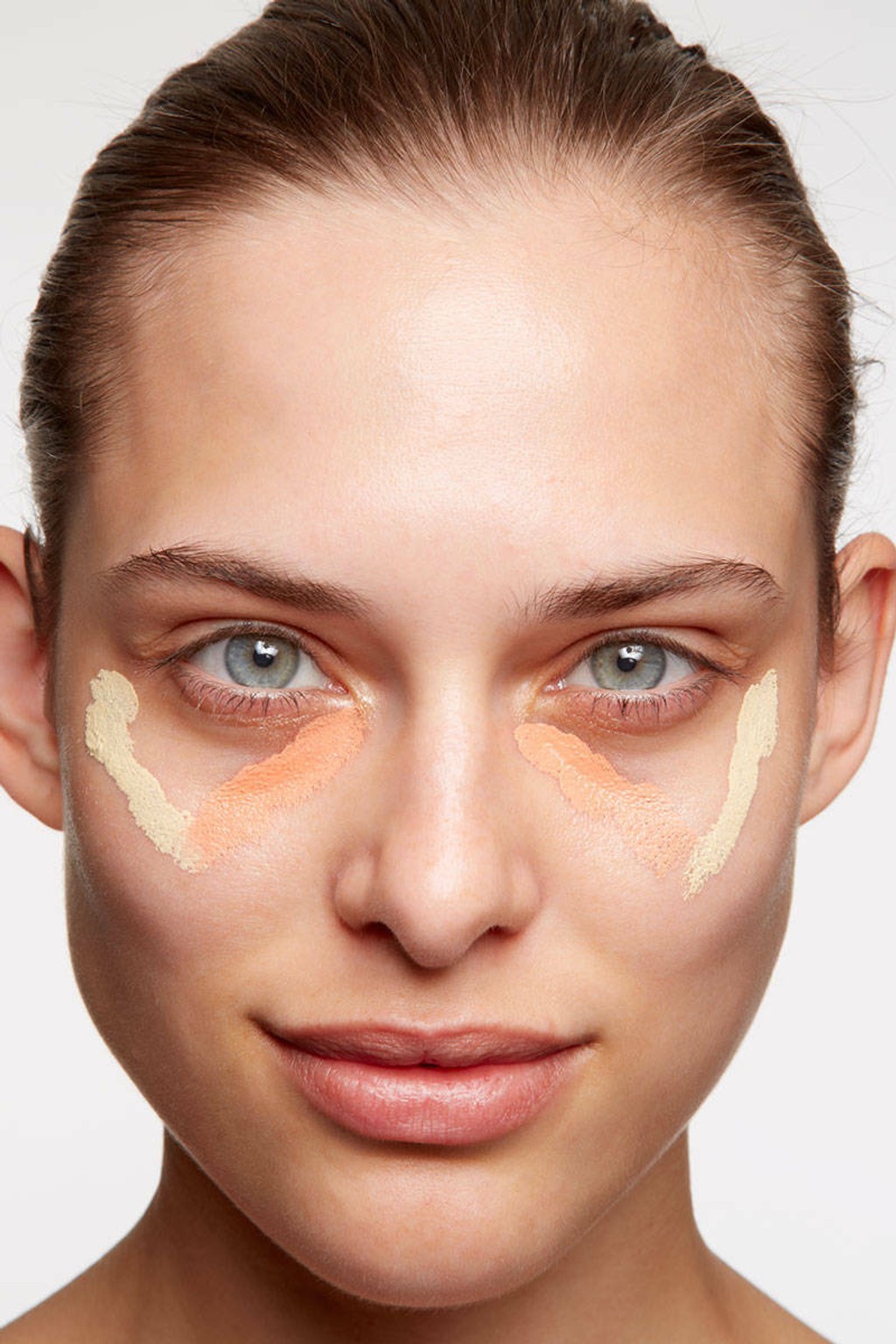 2. Vytvorte pod okom takzvané Hollywoodske Véčko. Žltú časť korektoru naneste na vonkajšiu čas lícnej kosti, oranžovú k vnútorným kútikom očí. Rozotrite.