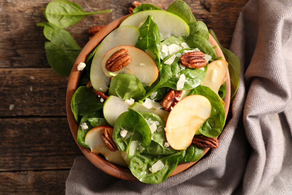 Budete potrebovať: šalátový mix (rukola, poľníček, špenát, čakanka), granátové jablko, 120 g kozieho syru, 80 g pekanových orechov