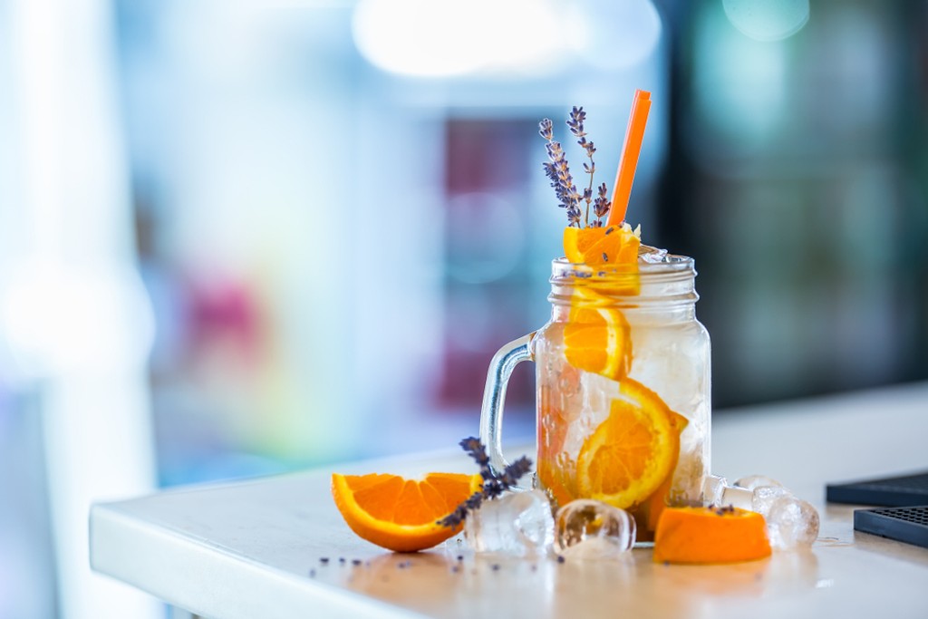 Budete potrebovať: 2 a pol litra vody, 1 kvapku levanduľového oleja, šťavu zo 6 citrónov, 1 a ½ lyžičky stévie, levanduľu a citrón/pomaranč na ozdobenie