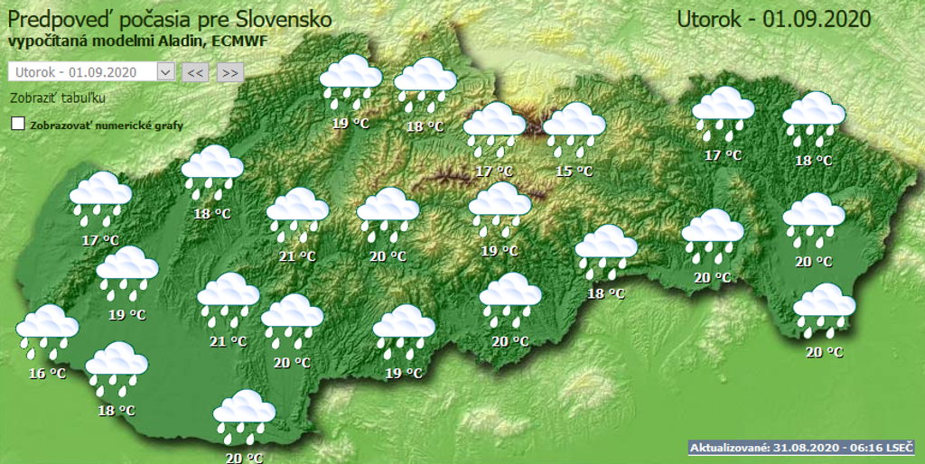 Aj nový školský rok sa podľa predpovede môže začať s dáždnikmi. V stredu (2.9.) bude prevažne veľká, len ojedinele aj zmenšená oblačnosť a miestami prídu prehánky alebo dážď. Na vrcholoch Tatier môže aj snežiť. Najvyššia denná teplota bude 17 až 22 stupňov.