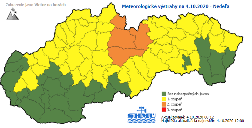 Druhý stupeň výstrahy platí v okresoch Liptovský Mikuláš, Brezno a Poprad. Nad pásmom lesa sa tam môže vyskytnúť vietor, ktorý krátkodobo v nárazoch dosiahne rýchlosť 135 - 160 kilometrov za hodinu.