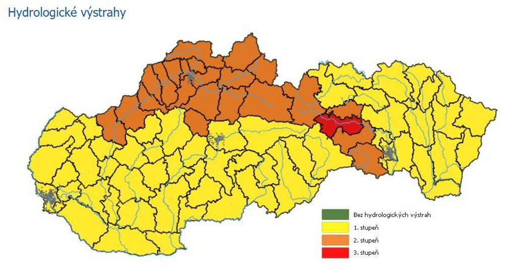 SHMÚ upozorňuje aj na prudké stúpanie vodných tokov. V platnosti sú aj naďalej hydrologické výstrahy na povodne z trvalého dažďa takmer pre celé územie Slovenska, s výnimkou krajného východu.