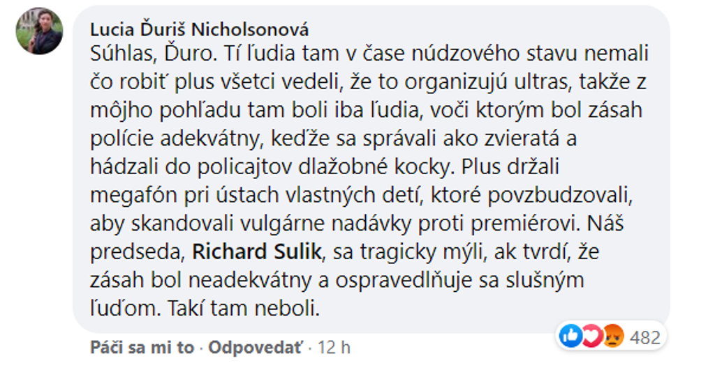 „Tí ľudia tam v čase núdzového stavu nemali čo robiť plus všetci vedeli, že to organizujú ultras, takže z môjho pohľadu tam boli iba ľudia, voči ktorým bol zásah polície adekvátny, keďže sa správali ako zvieratá a hádzali do policajtov dlažobné kocky. Plus držali megafón pri ústach vlastných detí, ktoré povzbudzovali, aby skandovali vulgárne nadávky proti premiérovi. Náš predseda, Richard Sulík, sa tragicky mýli, ak tvrdí, že zásah bol neadekvátny a ospravedlňuje sa slušným ľuďom. Takí tam neboli," uviedla Nicholsovná.