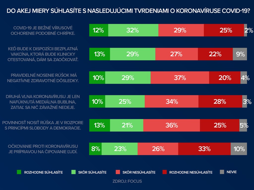 Z prieskumu vyplýva, že 44 percent učiteľov považuje nový koronavírus za bežné chrípkové ochorenie. Tomu, že pravidelné nosenie rúšok má negatívne zdravotné dôsledky, verí 39 percent učiteľov. Takmer tretina (31 percent) učiteľov na druhom stupni základných škôl si myslí, že očkovanie je prípravou na čipovanie ľudí.