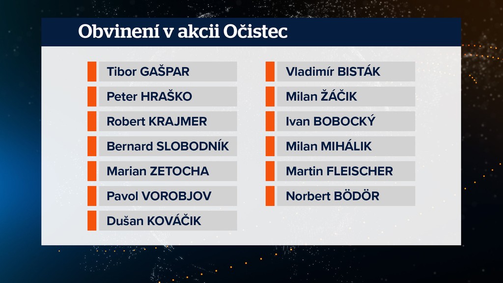 Medzi nimi aj zvučné mená, ktoré sa niekoľko rokov mali starať o našu bezpečnosť, chytať nebezpečných zločincov a odkrývať trestnú činnosť. Okrem iných Tibor Gašpar, Peter Hraško, Robert Krajmer, či Bernard Slobodník. Medzi obvinenými sú aj ďalší bývalí vplyvní šéfovia elitných jednotiek a odborov, súčasní a bývalí policajti.
