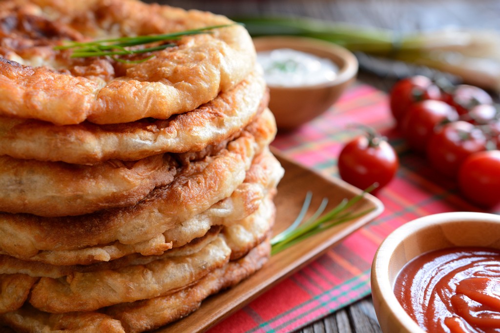 Langoše s kyslou smotanou - Budete potrebovať 1 téglik kyslej smotany, 2 tégliky polohrubej múky, lyžičku soli a lyžičku prášku do pečiva. Vymiesite si cesto a dáte ho na hodinu do chladničky. Taktiež si potom vytvarujete placky a usmažíte ich na panvici.