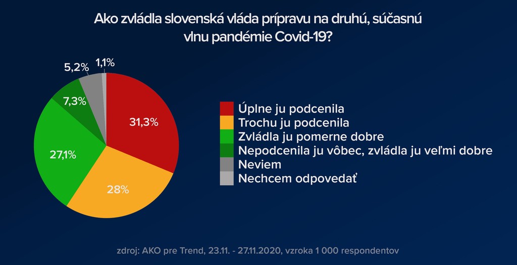 Agentúra AKO tiež zisťovala, aký názor majú ľudia na pripravenosť slovenskej vlády na druhú vlnu pandémie COVID-19. Takmer tretina občanov si myslí, že vláda príravu úplne podcenila. Ďalších 28 percent tvrdí, že ju vláda trochu podcenila. Pomerne dobre situáciu zvládla vláda podľa 27 percent opýtaných a veľmi dobre hodnotí pripravenosť sedem percent ľudí