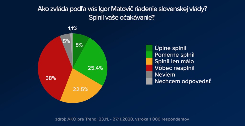 Zvláda premiér Igor Matovič riadenie slovenskej vlády? Až 60 percent ľudí tvrdí, že ich očakávania nesplnil alebo ich splnil iba málo. Opačný názor má 32 percent opýtaných. Vyplýva to z prieskumu agentúry AKO pre týždenník Trend.