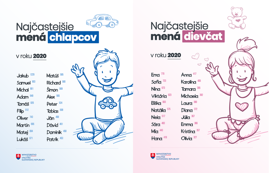 Najčastejšie mená tohtoročných dievčatiek sú Ema, Sofia a Nina. U chlapcov vedú Jakub, Samuel a Michal.