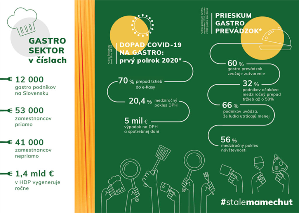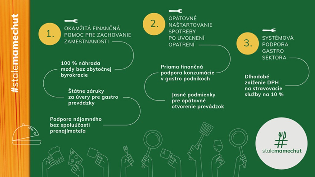 Trinásť združení a iniciatív podnikateľov a dodávateľov v gastro sektore, združených v platforme #StáleMámeChuť, konkrétne pomenovalo, ako by mohla vyzerať pomoc od štátu. Ide o šesť účinných opatrení rozložených do troch kategórií.