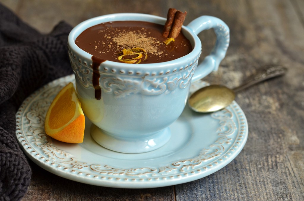Budete potrebovať: 800 ml čerstvého mlieka, 100 ml 30 percentnej smotany, 2ks škorice, 150 g horkej čokolády, 50g hnedého cukru, 100 ml pomarančovej šťavy, 2 plátky pomarančovej kôry