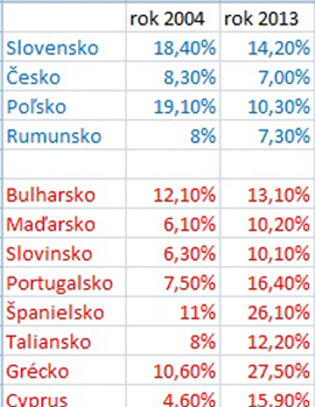 Miera nezamestnanosti vo vybraných štátoch v roku 2004 a 2013 podľa Eurostatu. Štáty vyznačené modrou farbou si polepšili, červené naopak: