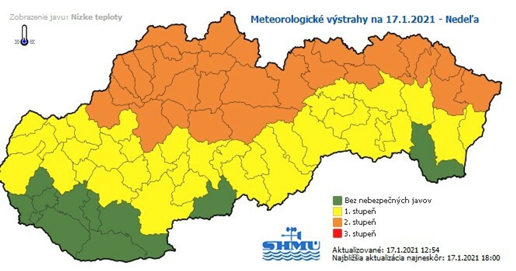SHMÚ vydal na nedeľnú noc aj výstrahy pred nízkymi teplotami. Pri výstrahe prvého stupňa môžu teploty klesnúť až do mínus 17 stupňov Celzia. Pre okresy na severe Slovenska platí výstraha druhého stupňa, kde môže byť teplota až mínus 25 stupňov Celzia.