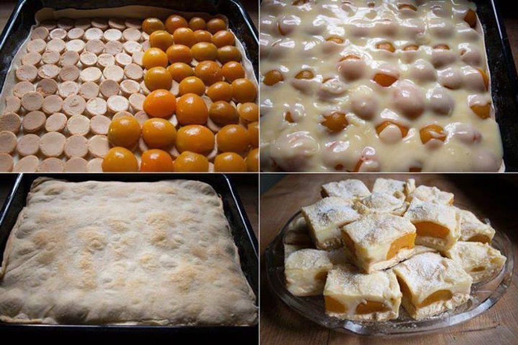 Lístkové cesto rozdelíme na dve polovicu. Jednu z nich rozvaľkáme a položíme na plech. Na cesto dáme piškóty, poukladáme zavárané alebo čerstvé mäkké marhule (aby sa upiekli) a všetko zalejeme pudingom uvareným z litra mlieka, pudingový práškov a cukru.