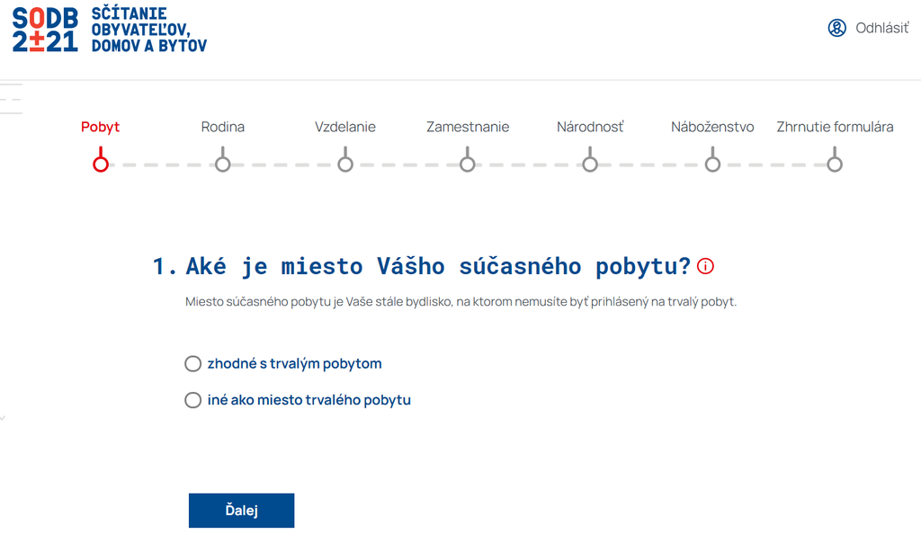 Formulár pozostáva zo 14 otázok, ak ste dieťa alebo dôchodca, niektoré otázky nevyplníte a systém ich automaticky preskočí. Ide o sekcie ako rodné číslo, otázky ohľadom pobytu (trvalého aj prechodného), rodiny, stavu, počtu osôb žijúcich vo vašej domácnosti, otázky ohľadom vzdelania, práce, povolania, bydlisko pracoviska, ale aj vierovyznanie, materinský jazyk a národnosť. Pri otázke, k akej národnosti sa hlásite, môžete uviesť až dve odpovede.