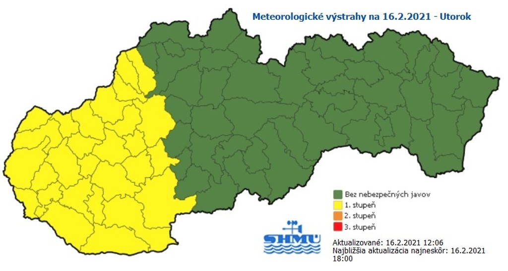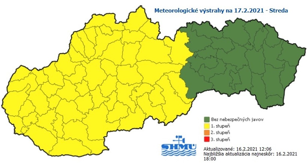Meteorológovia vydali rovnakú výstrahu aj na stredu (17.2.), v tomto prípade však platí aj pre stredné Slovensko. Okrem toho, pre severné časti vydali aj výstrahu 1. stupňa pred vetrom na horách.