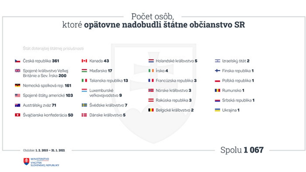 Ľudia, ktorí prijmú štátne občianstvo iného štátu, by už nemuseli prísť o slovenský pas. Počíta s tým novela zákona o štátnom občianstve z dielne ministerstva vnútra, ktorú v stredu schválila vláda. Slovenské štátne občianstvo by podľa návrhu mohli získať tiež bývalí občania SR, ktorí ho stratili na vlastnú žiadosť, ako aj osoby so slovenským pôvodom po jednom z rodičov, prarodičov alebo praprarodičov. Súčasný zákon pripravuje o slovenské občianstvo tých ľudí, ktorí prijmú občianstvo iného štátu. Takto oň prišlo už viac ako 3500 ľudí.