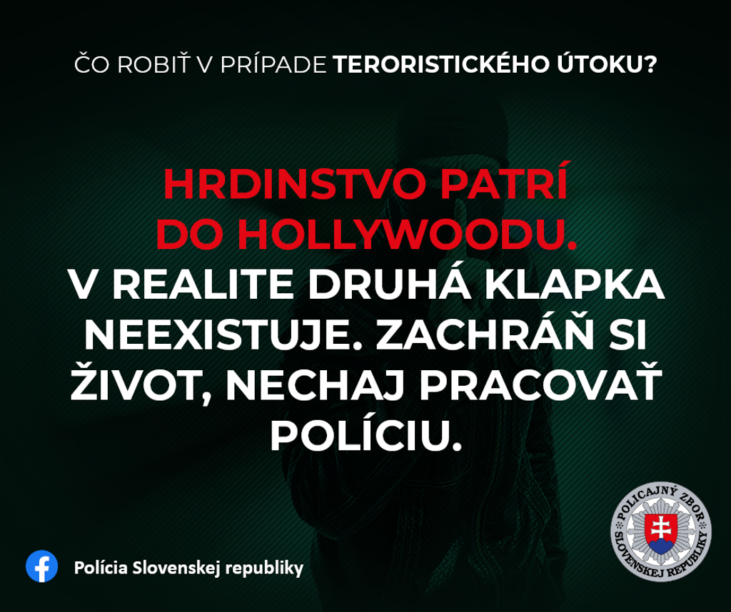 Ako informoval hovorca policajného prezídia Michal Slivka prvá myšlienka kampane poskytuje návod, ako by sa mali občania zachovať pri teroristickom útoku.
