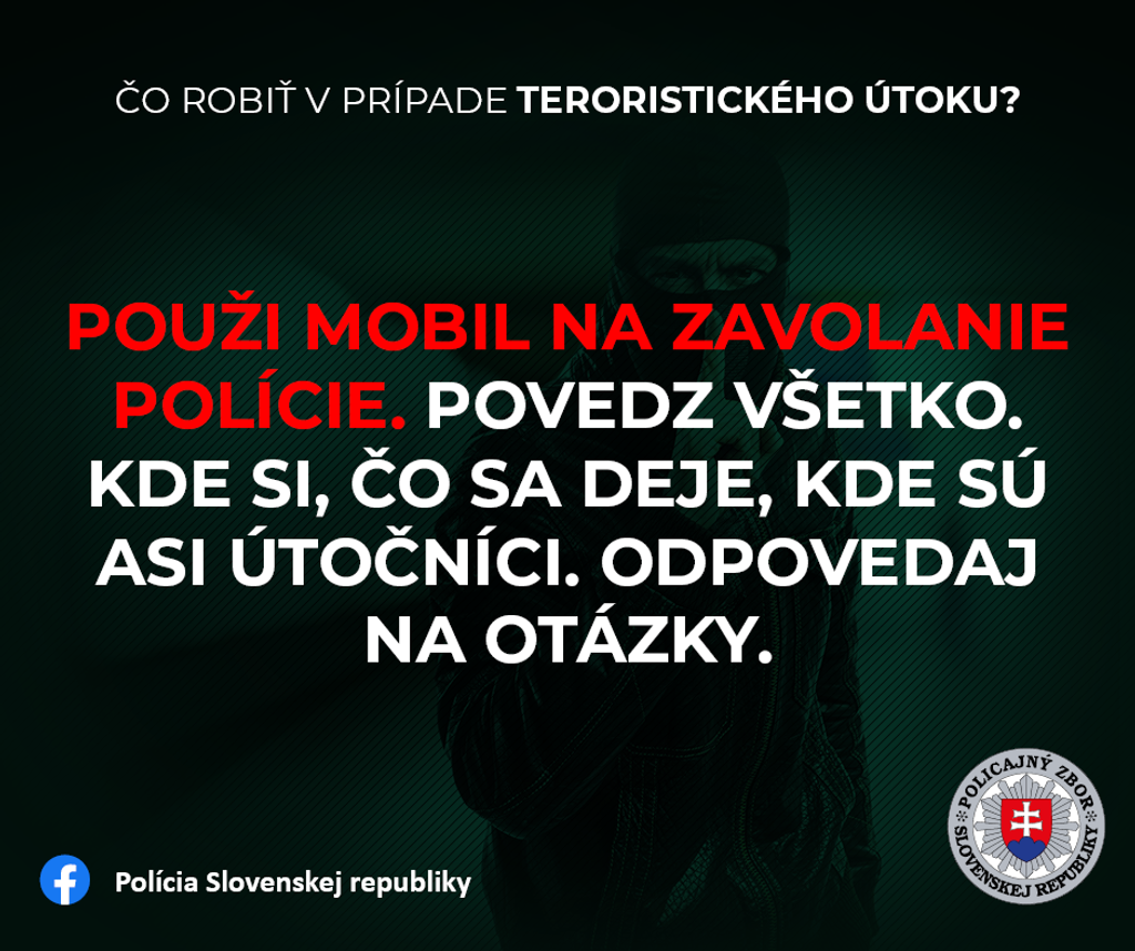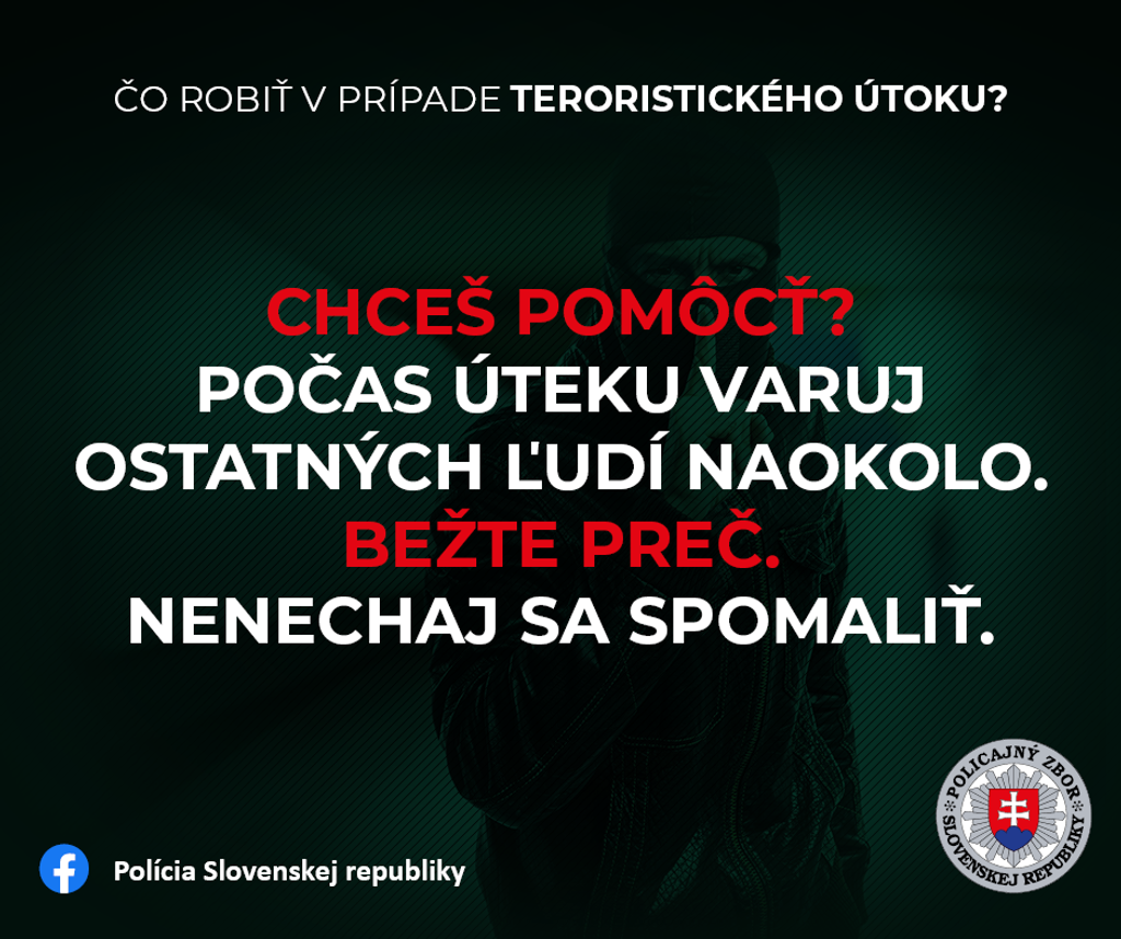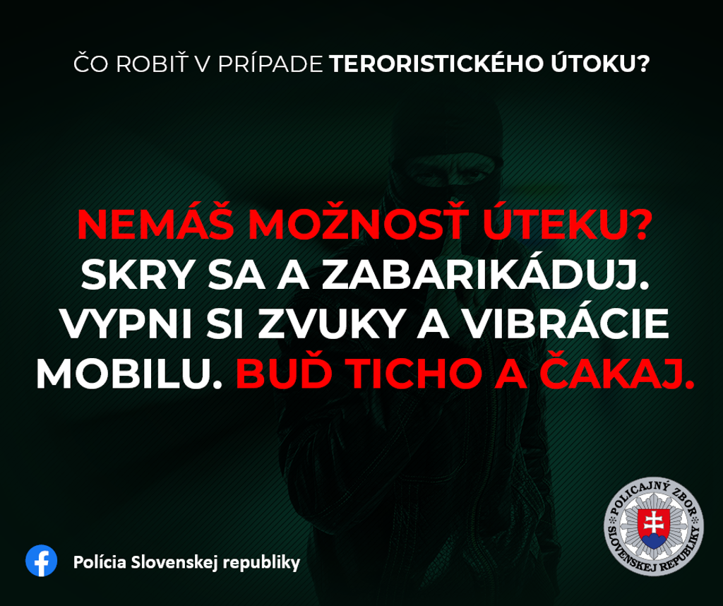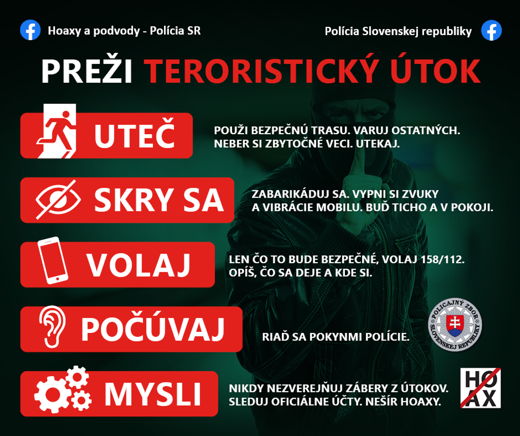 Policajný zbor a NAKA pripravili päť odporúčaní týkajúce sa prežitia prípadného teroristického útoku: Uteč - Skry sa - Volaj - Počúvaj - Mysli.