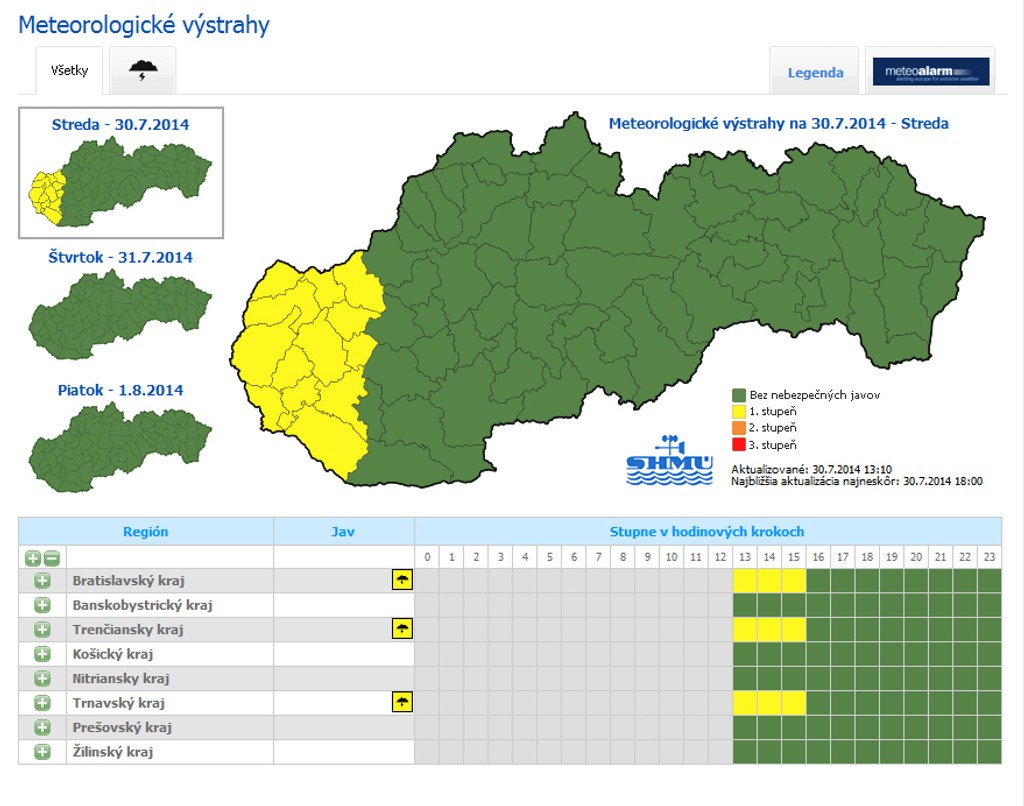 Výstraha platí do 16.00 hodiny. Týka sa siedmich okresov v Trnavskom kraji (Dunajská Streda, Galanta, Hlohovec, Piešťany, Senica, Skalica, Trnava), viacerých okresov v Bratislavskom kraji (celá Bratislava, Malacky, Pezinok a Senec) a dvoch okresov v Trenčianskom kraji (Myjava a Nové Mesto nad Váhom).