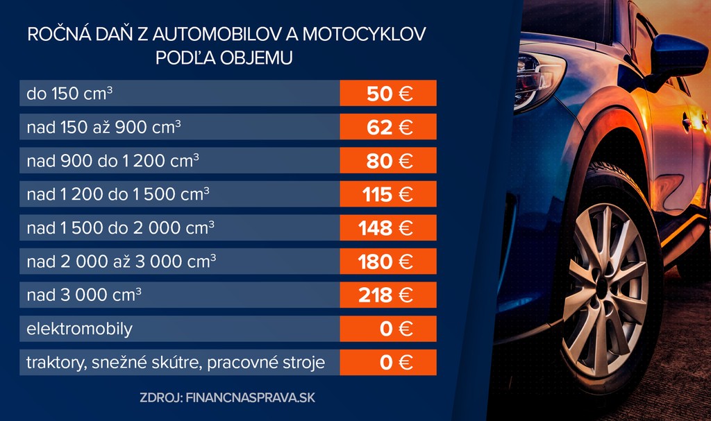 Vozidlá sú rozdelené do štyroch kategórií a musia byť evidované na Slovensku. Ročné sadzby dane upravuje zákon, v našej tabuľke nájdete sumu, ktorú musíte zaplatiť podľa objemu motora za osobné vozidlo.