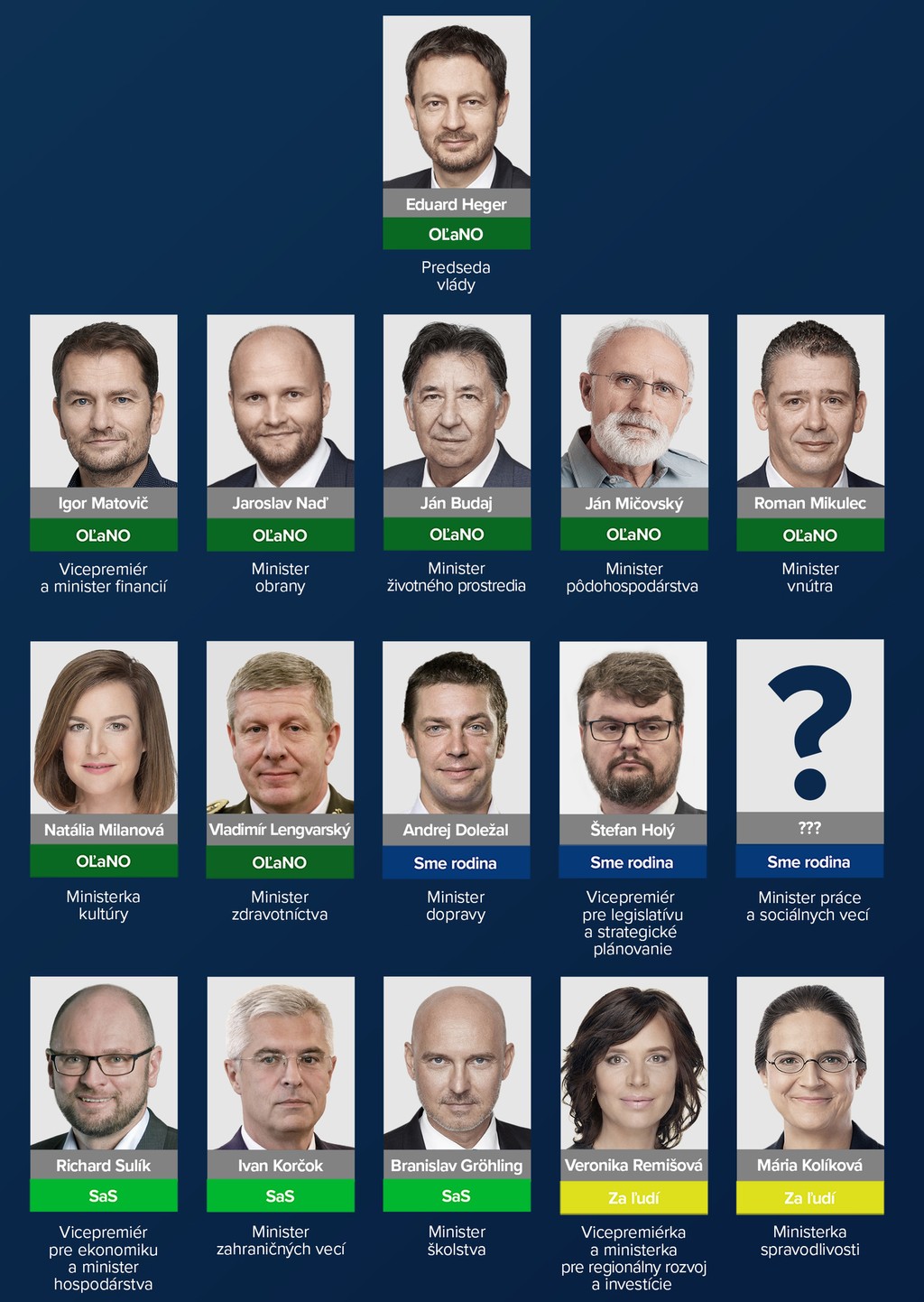 Ministerstvo financií povedie Igor Matovič, doterajší premiér, bude tiež podpredsedom vlády. Ministerstvo vnútra bude viesť Roman Mikulec, rezort zdravotníctva Vladimír Lengvarský, ministerstvo obrany Jaroslav Naď, rezort pôdohospodárstva povedie Ján Mičovský, ministerstvo životného prostredia Ján Budaj a rezort kultúry Natália Milanová (všetci OĽANO).