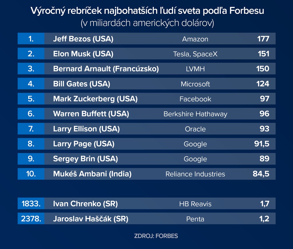 Majetok zakladateľa Amazonu tentoraz ocenili na 177 miliárd dolárov. Na druhom mieste je s majetkom 151 miliárd zakladateľ a šéf Tesly Elon Musk. Ten si oproti roku 2020 polepšil o neuveriteľných 29 priečok.