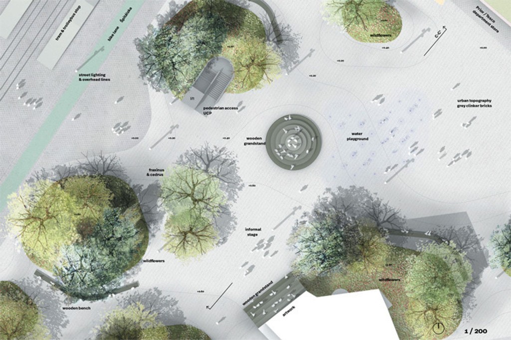 „Návrh preto pracuje so zeleňou aj osvetlením tak, aby tieto budovy mohli vyniknúť. Rešpektuje stromoradia po obvode námestia a novú výsadbu prispôsobuje prehľadnosti námestia," spresnilo mesto.