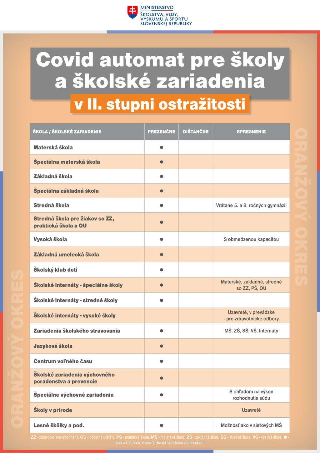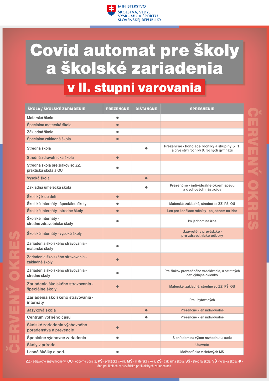 V červených okresoch (2. stupeň varovania) bude otvorený aj celý 2. stupeň ZŠ a tiež prvé štyri ročníky 8-ročných gymnázií, ktoré zodpovedajú 2. stupňu ZŠ.