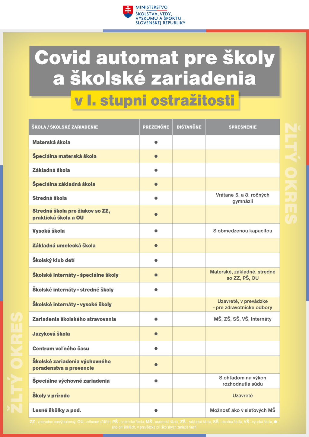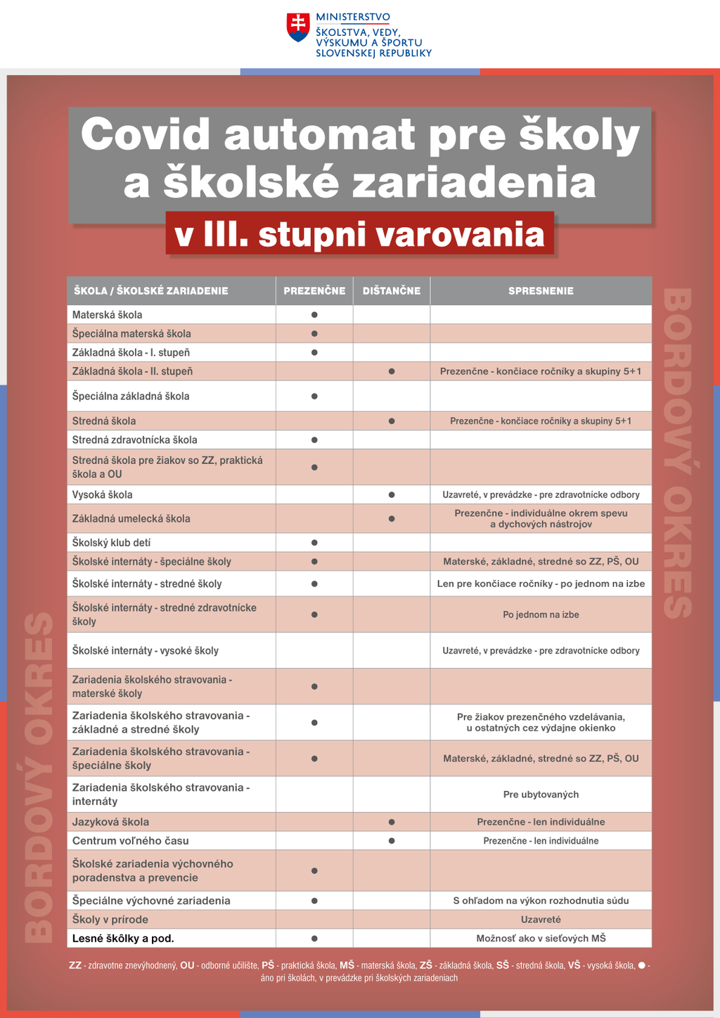 V bordových okresoch (3. stupeň varovania) budú nad rámec už otvorených škôl a školských zariadení v čiernych okresoch otvorené aj 8. a 9. ročníky ZŠ, poradenské centrá a tiež centrá voľného času a jazykové školy pre individuálnu výučbu.