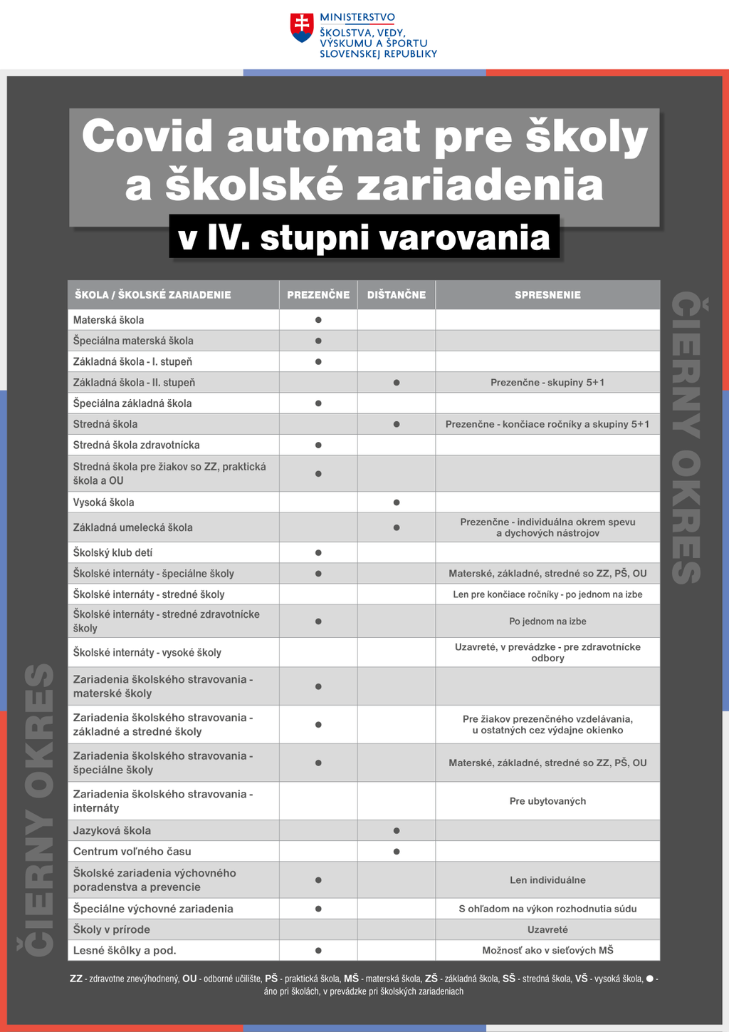 Čierne okresy ostanú v režime, ktorý platil plošne doposiaľ, teda do 11. apríla 2021 (otvorené v nich budú v zásade len materské školy, 1. stupeň ZŠ či stredné zdravotnícke školy a ostane tiež možnosť prezenčnej výučby v malých skupinách 5 + 1).