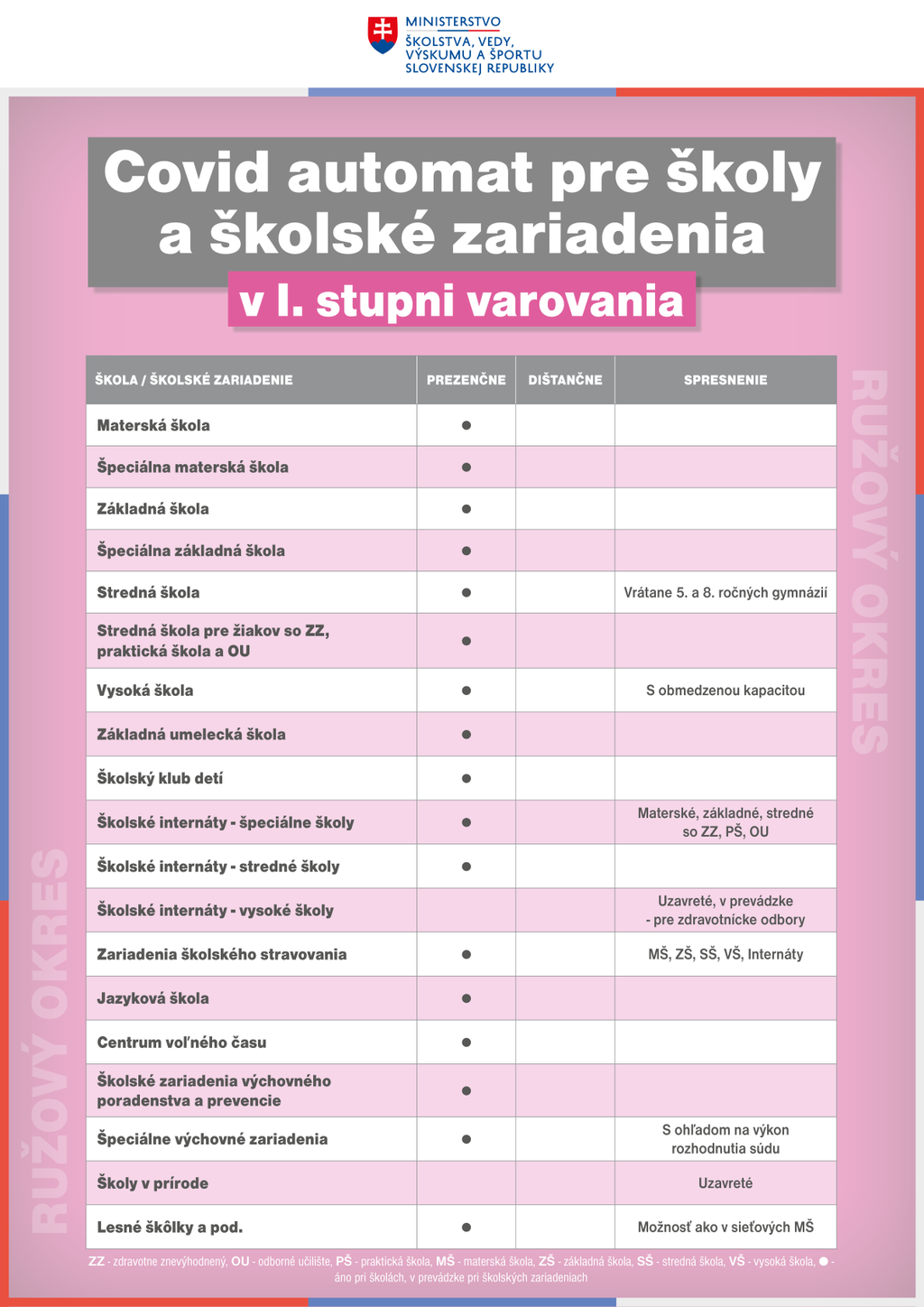 V ružových okresoch (1. stupeň varovania) budú otvorené aj stredné školy, jazykové školy, centrá voľného času a ZUŠ pre skupinovú výučbu.