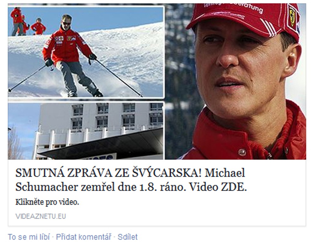 Sociálnou sieťou Facebook koluje ďalšia podvodná správa. Mnoho ľudí sa nechalo nachytať pred pár týždňami, kedy klikli na odkaz na článok o tom, ako našli záhadne zmiznuté malajzijské lietadlo. Samozrejme, že šlo o podvod. Rovnako teraz klikajú ostošesť na článok o smrti Michaela Schumachera, ktorý sa po pol roku od tragickej nehody na lyžiarskom svahu, prebral z umelého spánku. Článok ale tvrdí, že zomrel ráno prvého augusta.