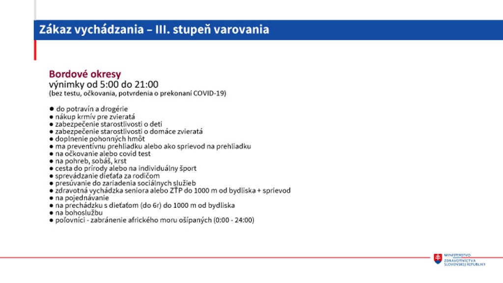Pravidlá pre vstup do prevádzok v okresoch v 3. stupni (pozn. bordové okresy) varovania zostávaju rovnaké: pri vstupe do prevádzok bude potrebné preukazovať sa negatívnym výsledkom testu, ktorý nie je starší ako 7 dní, alebo iným dokladom o výnimke, ktoré sú stanovené vo vyhláške (očkovanie, prekonanie ochorenia, zdravotné dôvody a pod.).