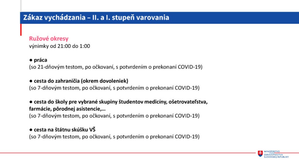 Pravidlá pre okresy v 1. a 2. stupni varovania zostávajú tak, ako doteraz, avšak výlučne pre časový rámec od 21.00 do 01.00 h nasledujúceho dňa (v tomto čase platí pre tieto stupne varovania zákaz vychádzania). To teda znamená, že v čase od 21.00 do 01.00 nasledujúceho dňa bude potrebné preukazovať negatívnym testom, ktorý nie je starší ako 21 dní v I. stupni varovania, v II. stupni varovania nie starším ako 14 dní. Rovnako je možné sa výlučne v tomto čase preukázať aj iným dokladom o výnimke.