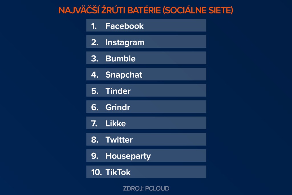 Švajčiarske online úložisko pCloud sa vo svojom poslednom výskume 100 najpopulárnejších mobilných aplikácii zameralo na tie energeticky najnáročnejšie. Zo zostaveného rebríčka vyplýva, že medzi najväčšími žrútmi bateriek je softvér, ktorý väčšina ľudí používa dennodenne.