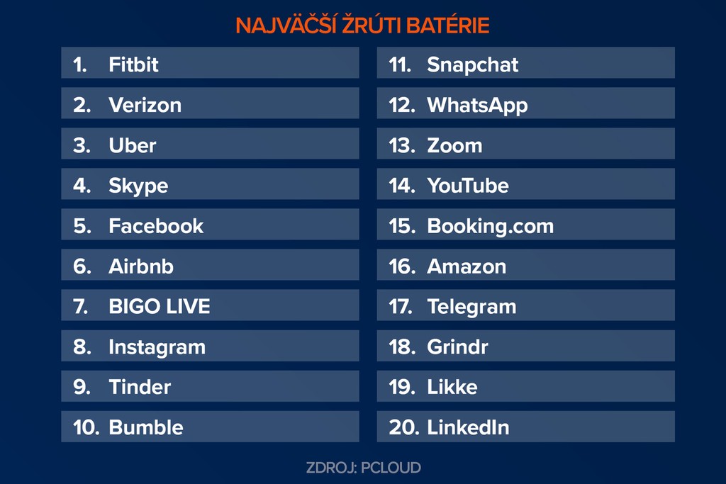 Úplne najväčšími zabijakmi batérií sú aplikácie Fitbit a Verizon, ktoré využívajú 14 zo 16 dostupných funkcií telefónu, naopak, najmenej energeticky náročná je aplikácia Linkedln. Na popredných priečkach sa umiestnili aj aplikácie sociálnych sietí.