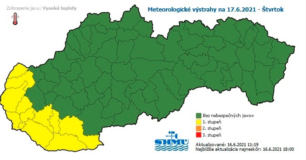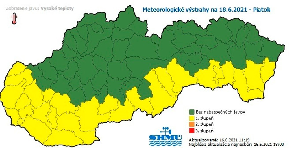 Upozornil na to Slovenský hydrometeorologický ústav (SHMÚ), ktorý na štvrtok (17. 6.) a piatok (18. 6.) vydal pre západné i južné Slovensko výstrahu pred vysokými teplotami. Miestami tu môže teplota vzduchu vystúpiť na 33 až 35 stupňov Celzia.
