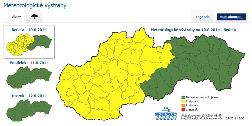 V súvislosti s nimi vydali meteorológovia výstrahu 1. stupňa, a to pre všetky kraje okrem Košického. Silné búrky s krúpami sa môžu objaviť predovšetkým medzi 12.00 h a 20.00 h.
