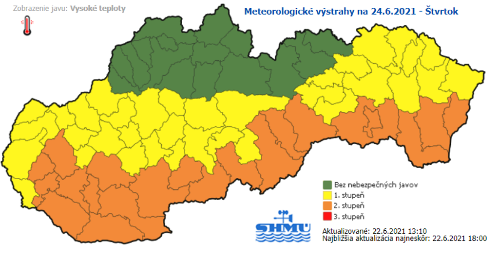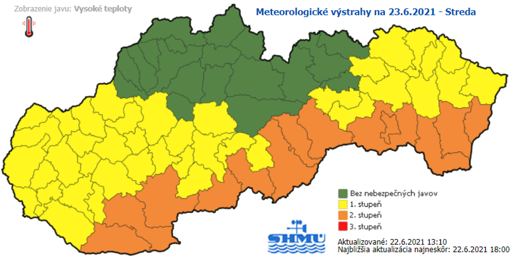 A to na nasledujúce dni SHMÚ vydal výstrahy prvého, ale aj druhého stupňa pred vysokými teplotami. V stredu a vo štvrtok bude tak ešte teplejšie ako predchádzajúce dni a teploty sa budú pohybovať na severe od 30 až po 37 stupňov na juhu.