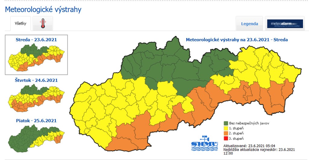Druhý stupeň varovania platí pre väčšinu okresov Košického kraja, aj pre okresy Lučenec, Revúca, Rimavská Sobota a Veľký Krtíš. Tiež pre okresy Komárno, Levice a Nové Zámky. Teploty tu môžu vystúpiť až na 35, miestami na 36 stupňov Celzia.