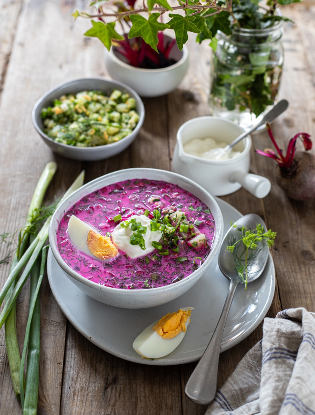 Uvarené zemiaky ošúpete a nakrájate na kocky, rovnako aj uhorky, cibuľku, kôpor i natvrdo uvarené vajíčka. Ingrediencie pridáte do cviklového vývaru. Ak sa vám bude zdať polivka hustá, pridáte trochu studenej prevarenej vody.