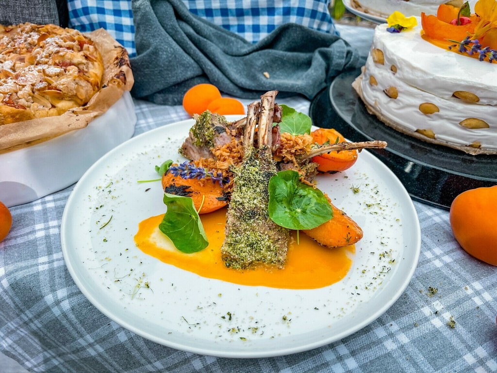 Postup: V rúre alebo na panvici si upečieme marhule. Zo získanej šťavy z pečenia a niekoľkých marhúľ bez šupky si vymixujte pyré, zvyšné upečené kúsky si dajte na bok. V miske si zmiešajte ľubovoľné bylinky, pridajte parmezán a podrvte/rozmixujte. Následne v zmesi obaľte jahňacie kotlety a z oboch strán ich opečte na panvici. Mäso by sa malo iba zatiahnuť, nemalo by byť úplne prepečené, pretože bude suché. Na druhej panici si pripravte chrumkavú cibuľu. Kotlety podávajte s broskyňami a posypte cibuľou.