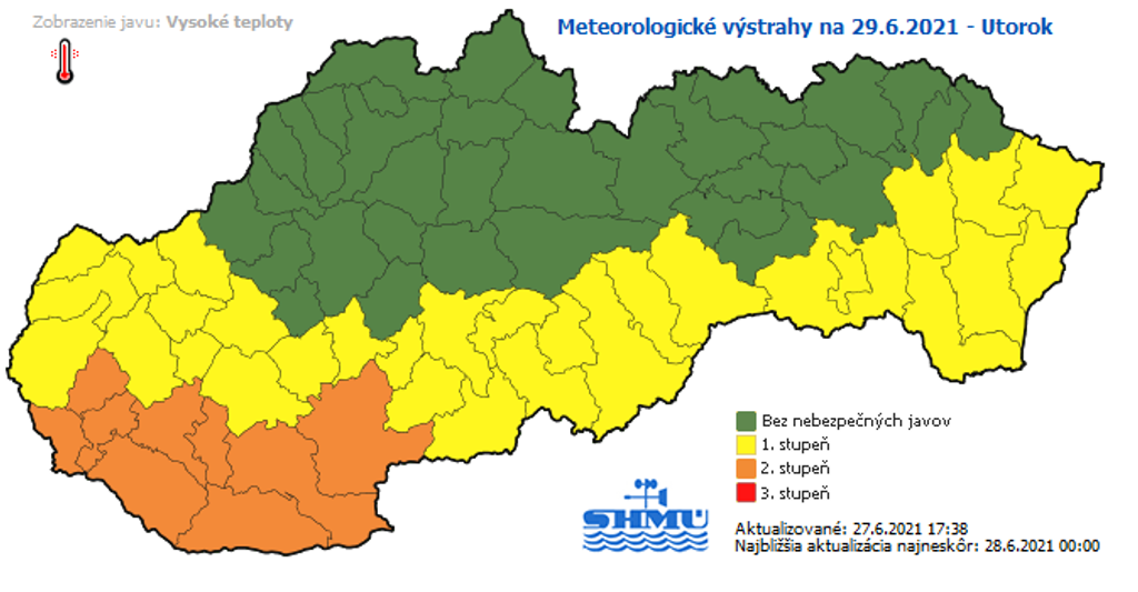 V pondelok (28. 6.) bude horúco v niektorých okresoch západného Slovenska. Slovenský hydrometeorologický ústav (SHMÚ) vydal výstrahu prvého stupňa pred vysokými teplotami pre niektoré okresy v Bratislavskom, Banskobystrickom, Nitrianskom a Trnavskom kraji.
