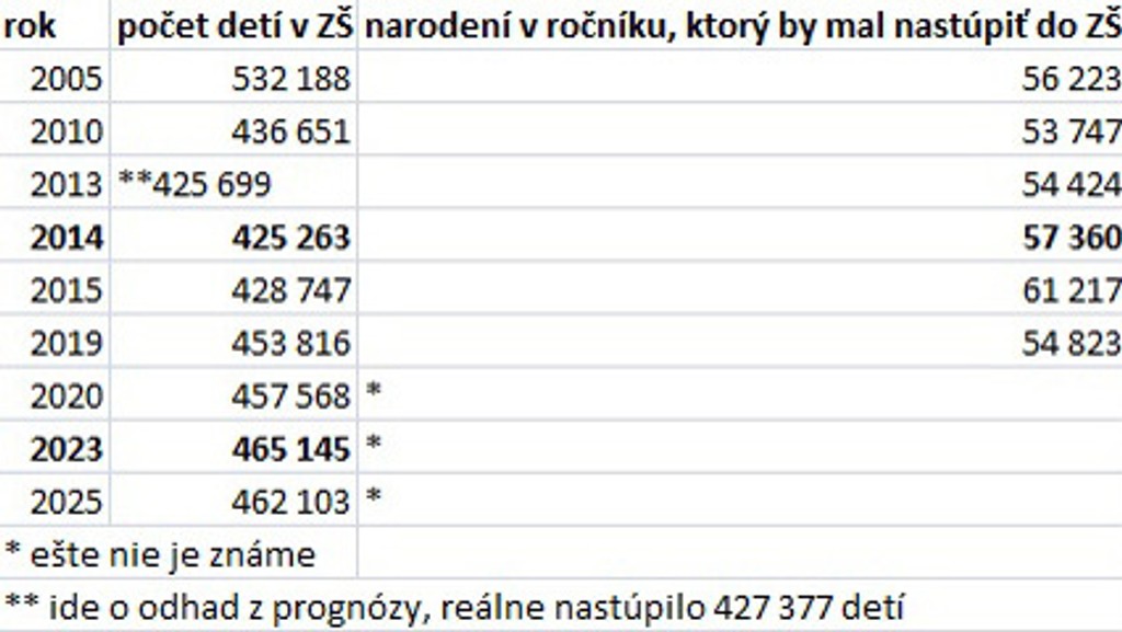 Letné prázdniny sa prehupli do druhej polovice a na obzore sa tak začína rysovať nový školský rok. Podľa štúdie Ústavu informácií a prognóz školstva by mal byť zlomový, pretože sa zrejme zastaví dlhoročné "scvrkávanie" základných škôl. V septembri 2014 bude podľa prognózy sedieť v laviciach necelých 425 300 žiakov, kým napríklad v roku 2005 ich bolo zhruba o 100-tisíc viac. V ďalšom období by malo žiakov pribúdať až do roku 2023, keď sa ich očakáva približne 465-tisíc. Následne sa vráti doterajší trend - ubúdanie.