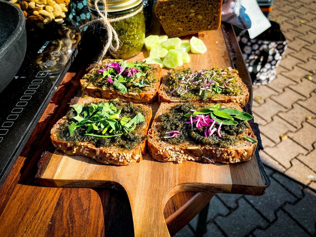 Ingrediencie: 150 g divokých byliniek, 200 ml olivového oleja, 8-10 g himalájskej soli, oriešky (píniové, kešu, slnečnicové semiačka, vlašské oriešky)