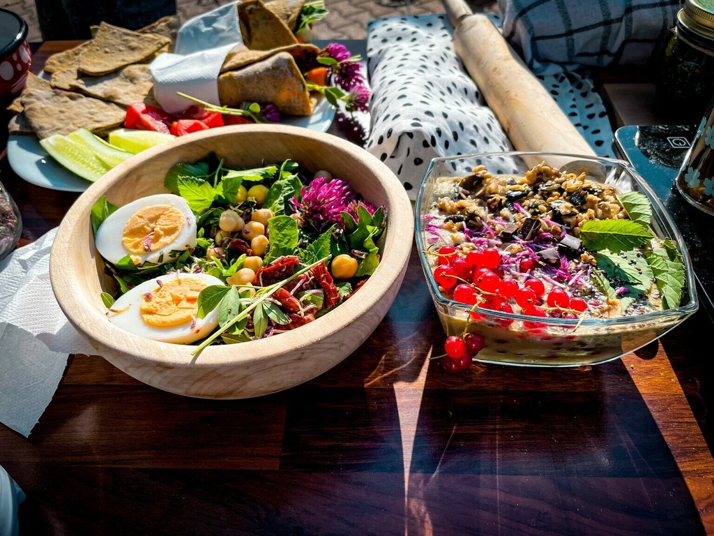 Ingrediencie: 1 veľkú hrsť menších púpavových listov, 1 hrsť jedlých byliniek podľa sezóny, 4 cherry paradajky, ½ hrnčeka uvareného cíceru, 1 natvrdo uvarené vajíčko, soľ, 1 PL citrónovej šťavy, 1 PL olivového oleja