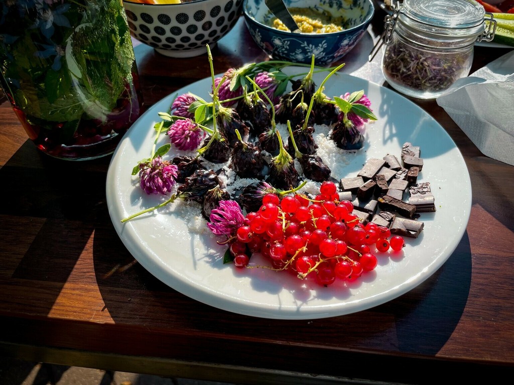 Ingrediencie: 2 hrste pekných, čerstvých kvietkov červenej ďateliny, 100 g horkej bio čokolády, papier na pečenie