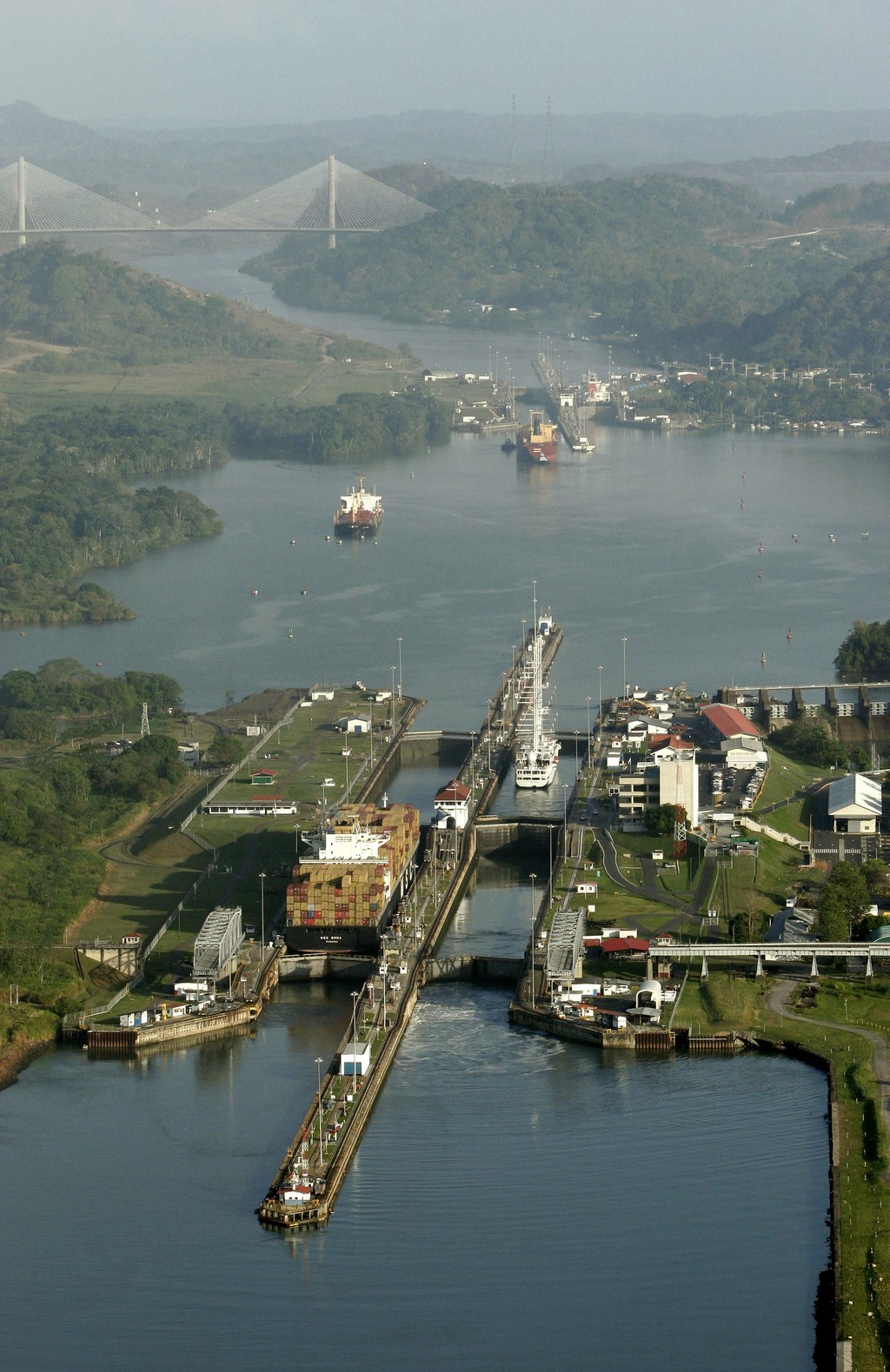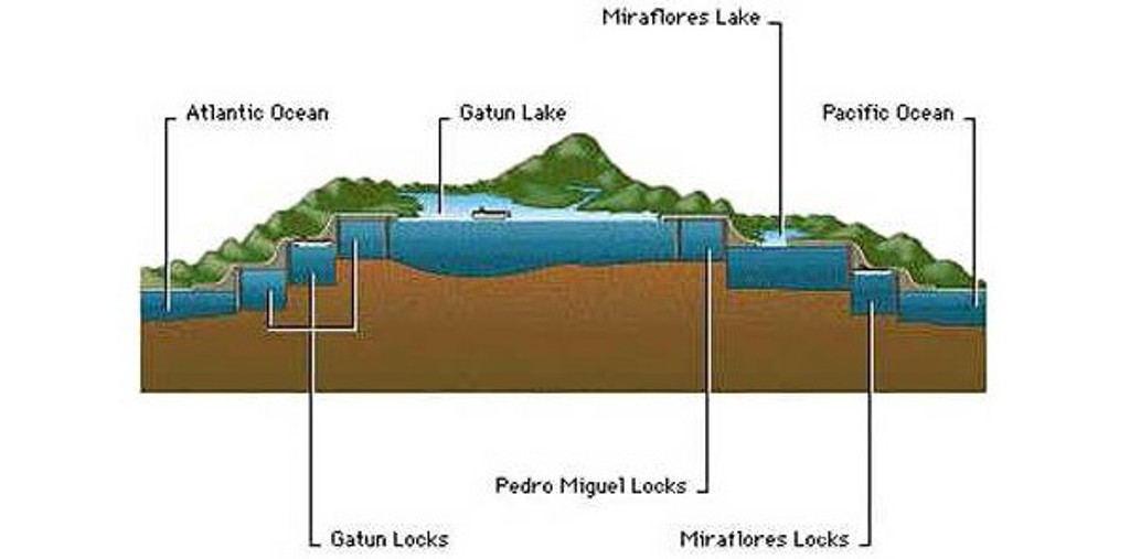 Panamský prieplav - dĺžka 77 km, plavebné komory sú hlboké 12,5 metra a široké 33,5 metra (v Gabčíkove sú komory široké 34 metrov a lode môžu prekonať výšku 23 metrov)